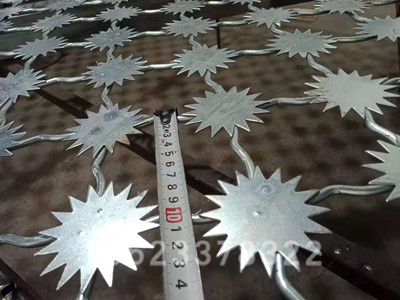 梅花刺片規(guī)格 | 直徑不小于7.5cm,刺片厚1.5mm,采用Q235低碳鋼板沖壓成型。梅花刺片用氬弧焊將梅花形刺片焊接在美格網(wǎng)的節(jié)點上,形成刺形保護,有效的防止了手握腳攀。 |
